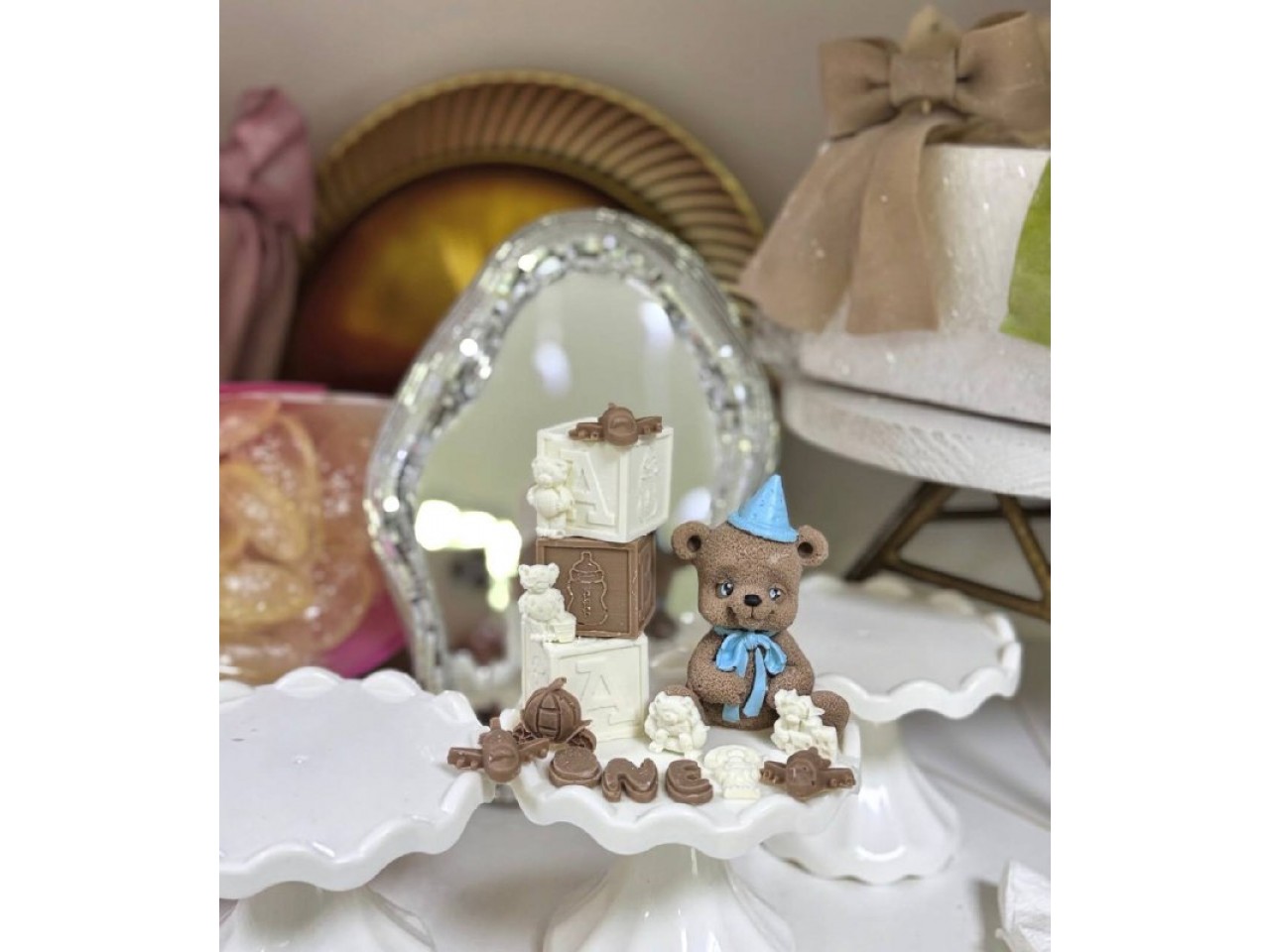 Декор на тортик "Ведмедик, one, 3 кубики, дрібні деталі"