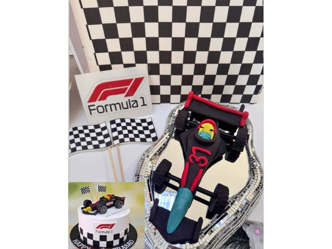 Декор "спортивна машина, емблема формула 1, прапорці, цукровий друк - квадрати"